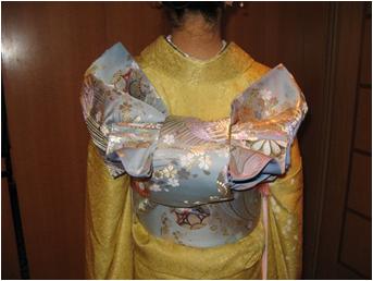 変則4つ山ヒダを作り、羽根を上向きに形作ります。お太鼓枕をあて帯揚げをか